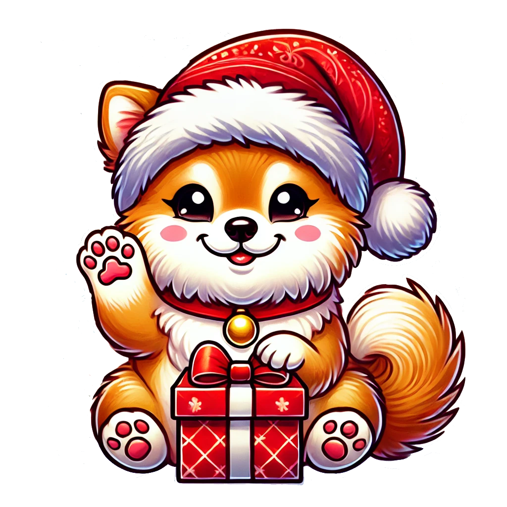 ふわふわ笑顔のポメラニアンが、サンタ帽と招き猫ポーズで元気を届けます。
