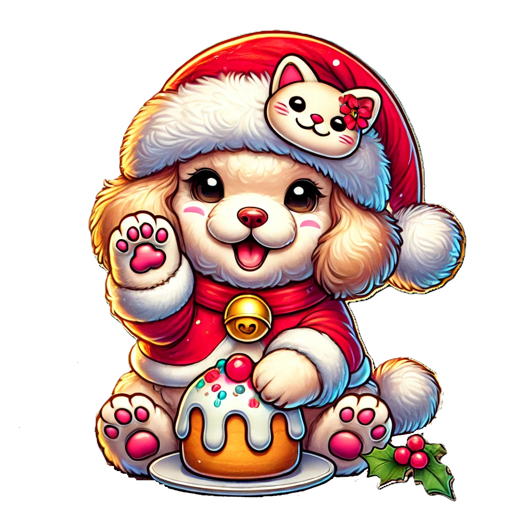 優しい表情のトイプードルが、サンタ帽と招き猫ポーズで癒しを届けます。