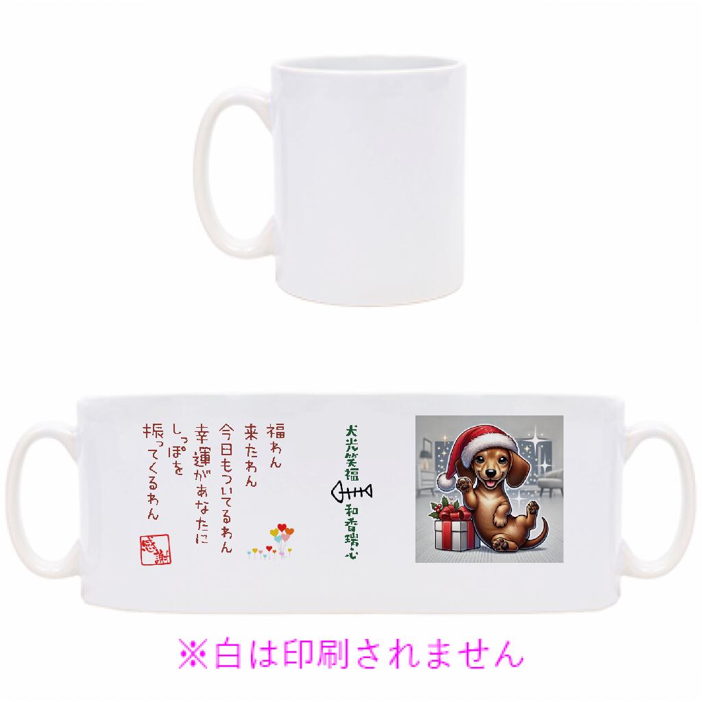#招き犬 #ダックスフンド #ダックスグッズ #ダックスマグカップ #犬光笑福 #縁起ことば #冒険運 #好奇心 #開運グッズ #縁起物 #クリスマスプレゼント #クリスマスギフト #犬好き #犬雑貨 #マグカップ #福わん堂 #正月 #招福 #縁起デザイン #華やか