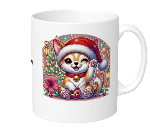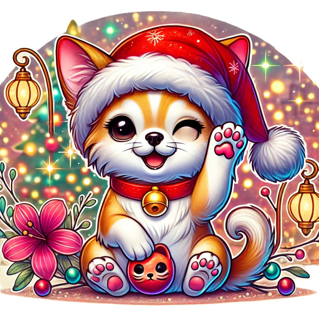 満面の笑顔のコーギーが、サンタ帽と招き猫ポーズで幸福を届けます。